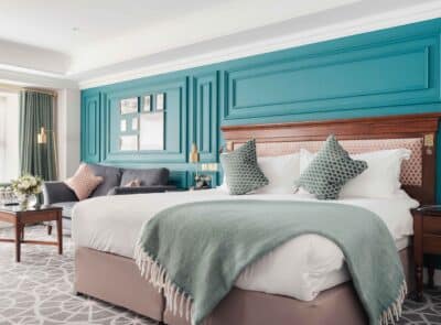 Elegant hotel room with plush king bed, stylish teal decor, cosy seating, window views, and modern amenities.