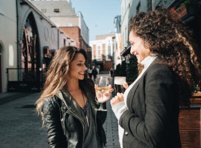 Two women enjoying drinks outside, smiling in a lively street scene, capturing social vibes near stylish hotel venues.